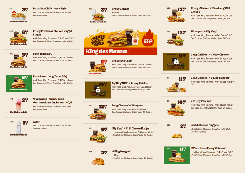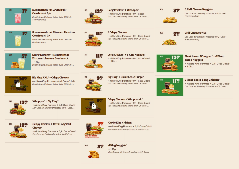 Nachfolgend findest du die aktuellsten Burger King Coupons, von denen wir wissen. Teilweise handelt es sich dabei um die „klassischen“ Papierbögen, die man im Briefkasten finden kann, teilweise – und immer häufiger – haben wir aber auch die Burger King Coupons übersichtlich zusammengefasst, die wir online oder in der App gefunden haben. In diesem Fall kannst du die 3-stelligen Nummern, die neben dem jeweiligen Angebot stehen, bei deiner Bestellung eingeben. Manche Angebote sind allerdings erst verfügbar, wenn du bei Burger King eingeloggt bist. Selbstverständlich kannst du dir die Burger King Coupons auch als übersichtliches PDF herunterladen.