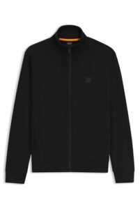 Die BOSS Sweatjacke ist eine locker geschnittene Herrenjacke aus Baumwoll-French-Terry. Sie besteht aus 100 % Baumwolle und ist als Regular Fit mit geradem Schnitt ausgeführt. Die Webart ist Plain, der Verschluss erfolgt über einen durchgehenden Reißverschluss. Seitliche Eingrifftaschen sind im oberen Bereich integriert. Rippbündchen an Manschetten, Bund und Kragen sorgen für eine stabile Form, wobei diese Bereiche aus 97 % Baumwolle und 3 % Elasthan gefertigt sind. Ein Logo-Aufnäher sowie dezente Naht-Details ergänzen das sachliche Design. Das Herkunftsland ist Bangladesch.