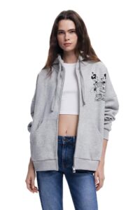 Das Desigual 25swsk28 Better Sweatshirt ist ein Damen-Sweatshirt in Regular-Passform mit klarer, funktionaler Ausrichtung. Es verfügt über eine Kapuze, lange Ärmel und einen durchgehenden Reißverschluss im Pull-on-Stil, der ein unkompliziertes An- und Ausziehen ermöglicht. Die schwarze Farbgebung sorgt für eine zurückhaltende, vielseitige Optik, während ein Mickey-Mouse-Print einen grafischen Akzent setzt. Gerippte Manschetten und ein gerippter Abschluss unterstützen den Sitz und geben dem Kleidungsstück eine sportlich geprägte Struktur. Das Modell stammt aus der Produktion in China und folgt einer geradlinigen, alltagstauglichen Gestaltung ohne auffällige Zusatzfunktionen.