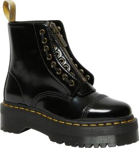 Die beliebte Stiefel-Reihe Sinclair wurde mit synthetischem Material neu entwickelt. Die für Dr. Martens typische gelb-weiße Fersenschlaufe ist dabei nicht vergessen worden. Auch die gelbe Naht entlang der Plattform-Sohle ist am lederfreien Schuh vorhanden.