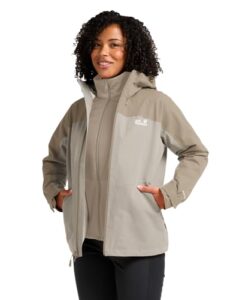 Die Jack Wolfskin Damen Wild Places 3 in 1 ist eine funktionale Winterjacke mit 3-in-1-Reißverschlusssystem. Du kombinierst eine wasserdichte TEXAPORE ECOSPHERE CORE TASLAN Außenjacke mit einer separat tragbaren Innenjacke. Die Außenjacke besteht vollständig aus recyceltem Polyester, ist wasserdicht und atmungsaktiv und verfügt über einen 2-Wege-Reißverschluss. Eine fest verbundene Kapuze lässt sich in Volumen und Gesichtsfeld einstellen. Zwei Hüfttaschen und eine zusätzliche Geheimtasche bieten Stauraum für alltägliche Gegenstände.