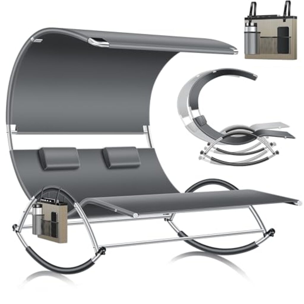 Da der stabile Rahmen der Doppelliege rundlich geformt ist, könnt ihr sie auch als Schaukelliege benutzen. Die Sonnenliege eignet sich für kleine Ruhepausen und bietet dir durch eine mitgelieferte Hängetasche genügend Stauraum für deine Getränke, den Laptop oder ein Buch.