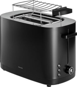 Der Toaster wird mit einem Brötchenaufsatz geliefert und verfügt über eine integrierte Kabelaufwicklung für geordnetes Verstauen. Die Farbe Schwarz sorgt für ein unauffälliges Erscheinungsbild in der Küche. Aktuell ist der ZWILLING ENFINIGY Toaster um 8 % reduziert und kostet 92,75 € statt 100,79 €.