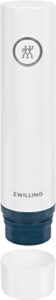 Die ZWILLING Fresh & Save Vakuumpumpe ist ein kompaktes Gerät zur luftdichten Aufbewahrung von Lebensmitteln. Mit Abmessungen von 45 x 45 x 195 Millimetern und einem Gewicht von 400 Gramm liegt sie handlich in der Hand und arbeitet kabellos mit einem langlebigen Lithium-Ionen-Akku (3,7 V, 1200 mA). Das Gehäuse besteht aus Hochglanzkunststoff (ABS), der Vakuumaufsatz aus lebensmittelechtem Silikon. Über das beiliegende USB-Ladekabel (Typ A, Micro-USB, 0,3 m) lässt sich die Pumpe einfach aufladen.