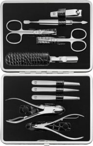 Zum Lieferumfang gehören Nagelschere, Hautschere, Nagelknipser, Saphir-Nagelfeile, schräge, spitze und gerade Pinzette, ein 2-in-1 Maniküre-Instrument, Nagelzange sowie eine Hautzange. Das Set deckt damit grundlegende Anwendungen der Nagel- und Hautpflege ab. Das Etui schützt die Instrumente zuverlässig und sorgt für eine geordnete Aufbewahrung.