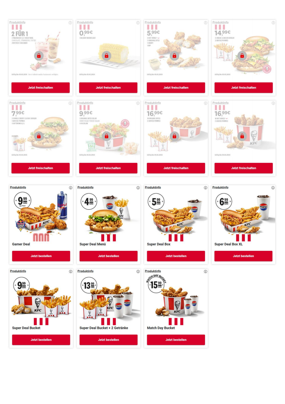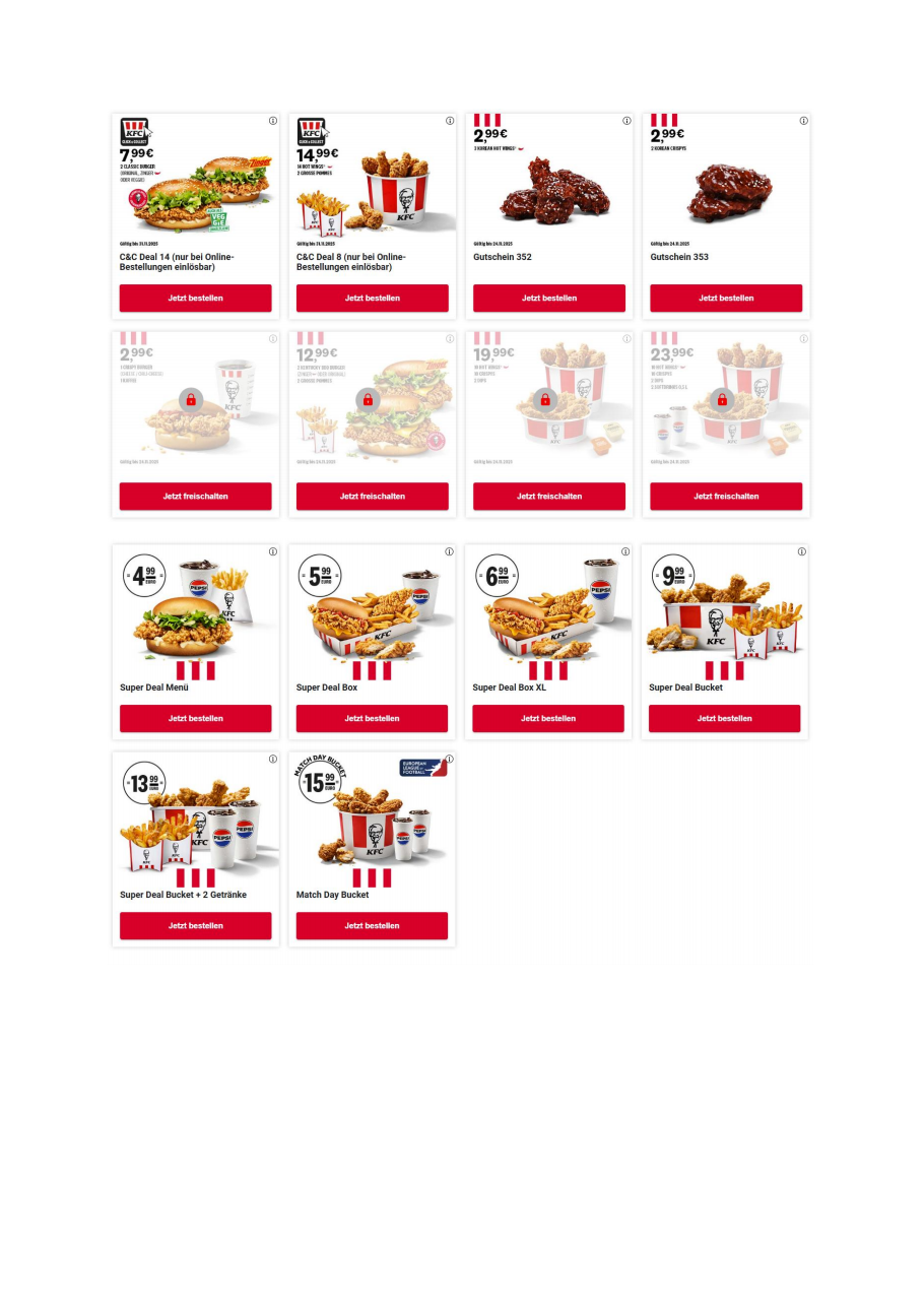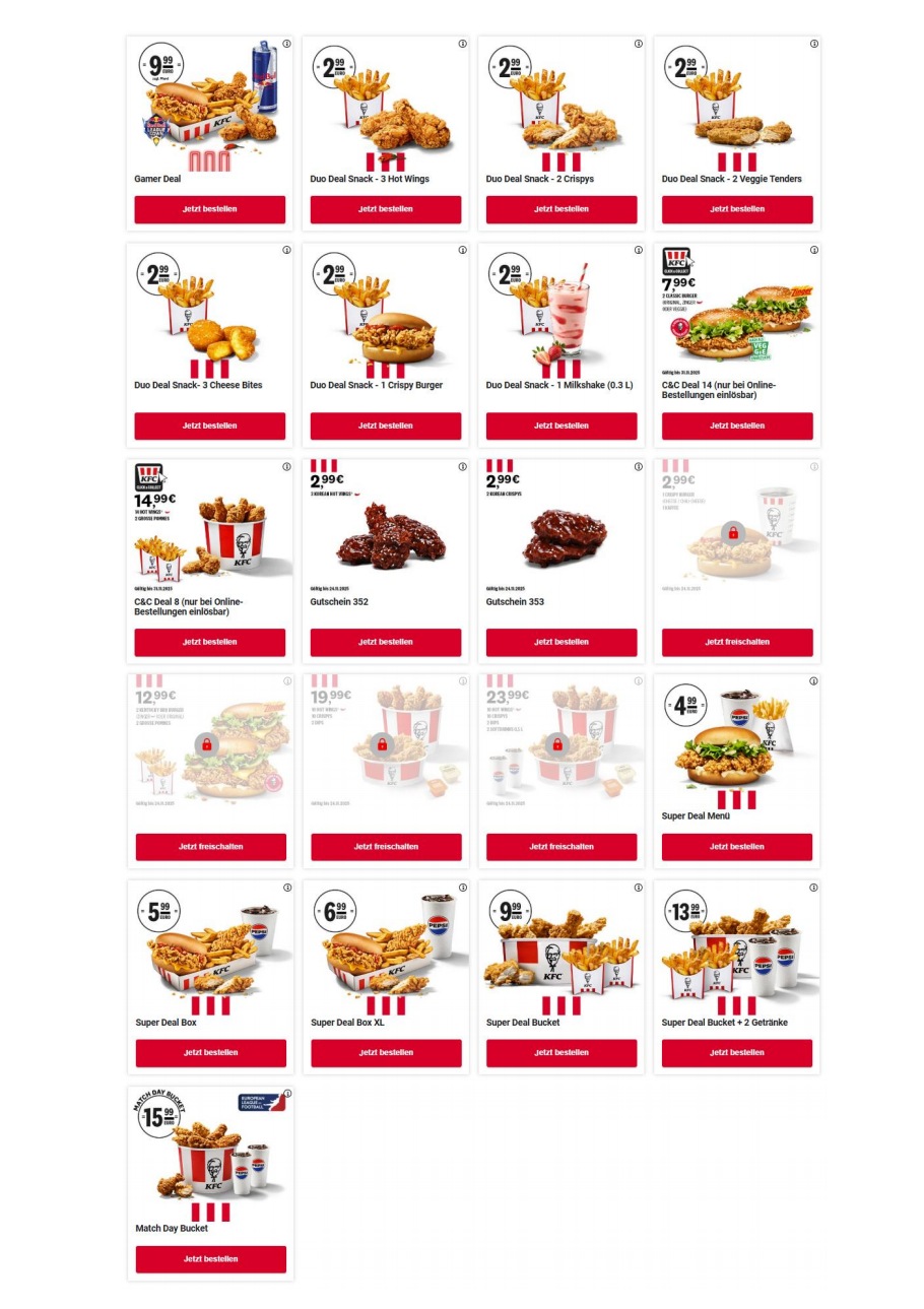 Nachfolgend findest du die aktuellsten KFC Gutscheine, die uns bekannt sind. Teilweise bekommst du bei deiner Bestellung durch die Gutscheine starke Rabatte. Bitte beachte dabei, dass die Gutscheine häufig nur im Rahmen von Online-Bestellungen eingelöst werden können oder erst freigeschaltet werden, wenn du dich bei KFC registriert hast und auf der Webseite eingeloggt bist. Wenn du häufiger bei KFC zu Gast bist, kann sich auch die KFC-App für dich lohnen. Auch hiermit hast du deine KFC Gutscheine immer griffbereit und du kannst dich über Aktionen und Angebote bei KFC informieren. Nachfolgend kannst du dir die KFC Gutscheine als übersichtliches PDF herunterladen.