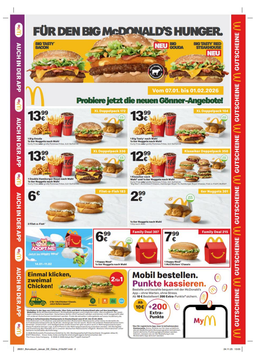 Nachfolgend findest du die aktuellsten McDonald’s Gutscheine, von denen wir wissen. Neben Rabatten auf Einzelprodukte bekommst du teilweise beim Kauf eines Produktes oder eines Menüs ein weiteres Produkt gratis dazu. Auch die Gutscheine für Familien, bei welchen du zu deinem Produkt oder Menü noch ein Happy Meal dazu bekommst, können sich echt lohnen. Gehst du gerne bei McDonald’s frühstücken? Auch dafür gibt es spannende Gutscheine bei denen du richtig sparen kannst. Nachfolgend kannst du dir die McDonald‘s Coupons als übersichtliches PDF herunterladen und anschließend entweder digital auf deinem Smartphone speichern oder bei Bedarf auch ausdrucken. So hast du die McDonald’s Gutscheine immer dabei und kannst sie im Restaurant bei deiner Bestellung vorzeigen oder die 3-stelligen Nummern am Bestell-Terminal im Restaurant eingeben bzw. im McDrive durchgeben. Alternativ kannst du die Gutscheine auch direkt in der App von McDonald’s auswählen und aktivieren. Wirf auf jeden Fall auch einen Blick auf die App, wenn du regelmäßig bei McDonald’s zu Gast bist. In der McDonald‘s-App gibt es nämlich häufig noch zusätzliche Gutscheine, die sich für dich lohnen können, sowie Punkte, die du sammeln und gegen kostenlose Produkte einlösen kannst.